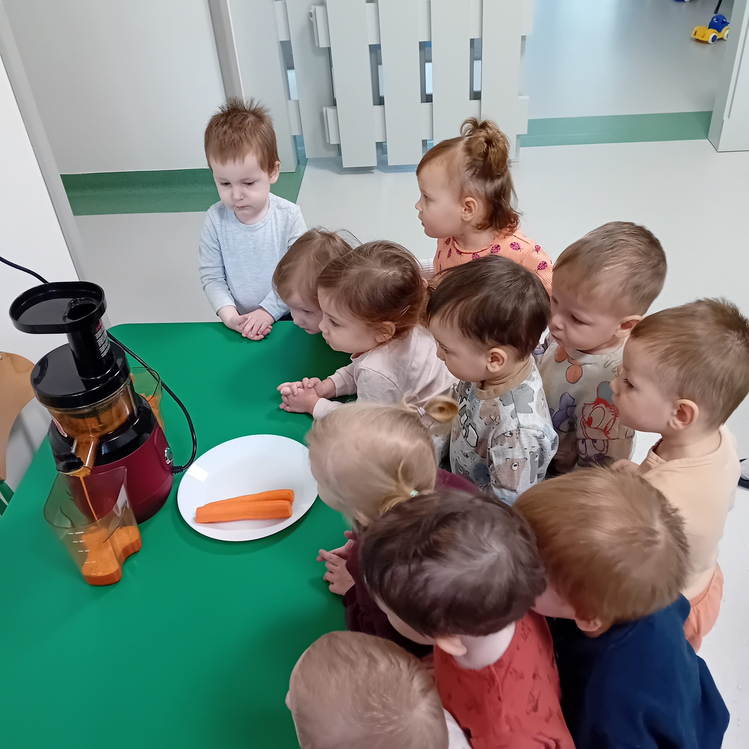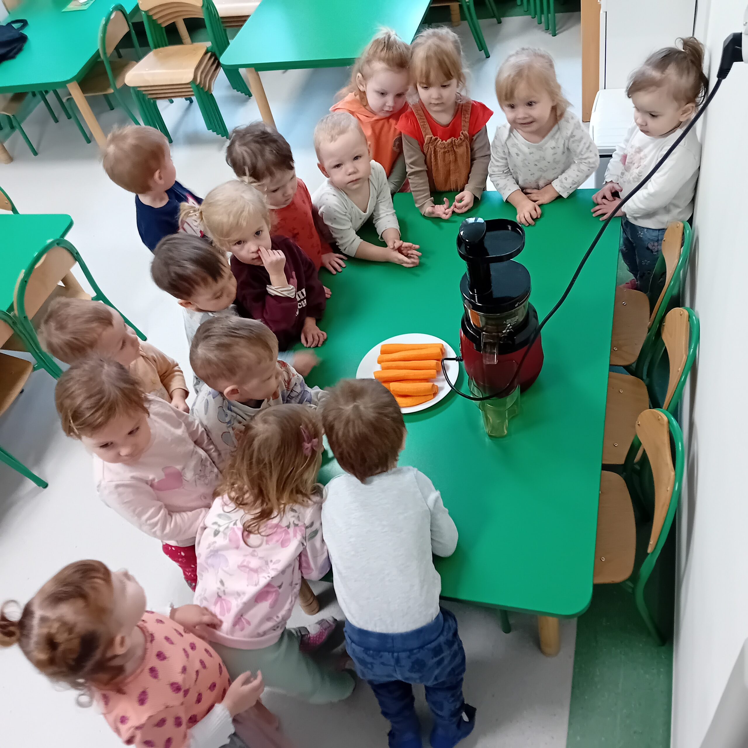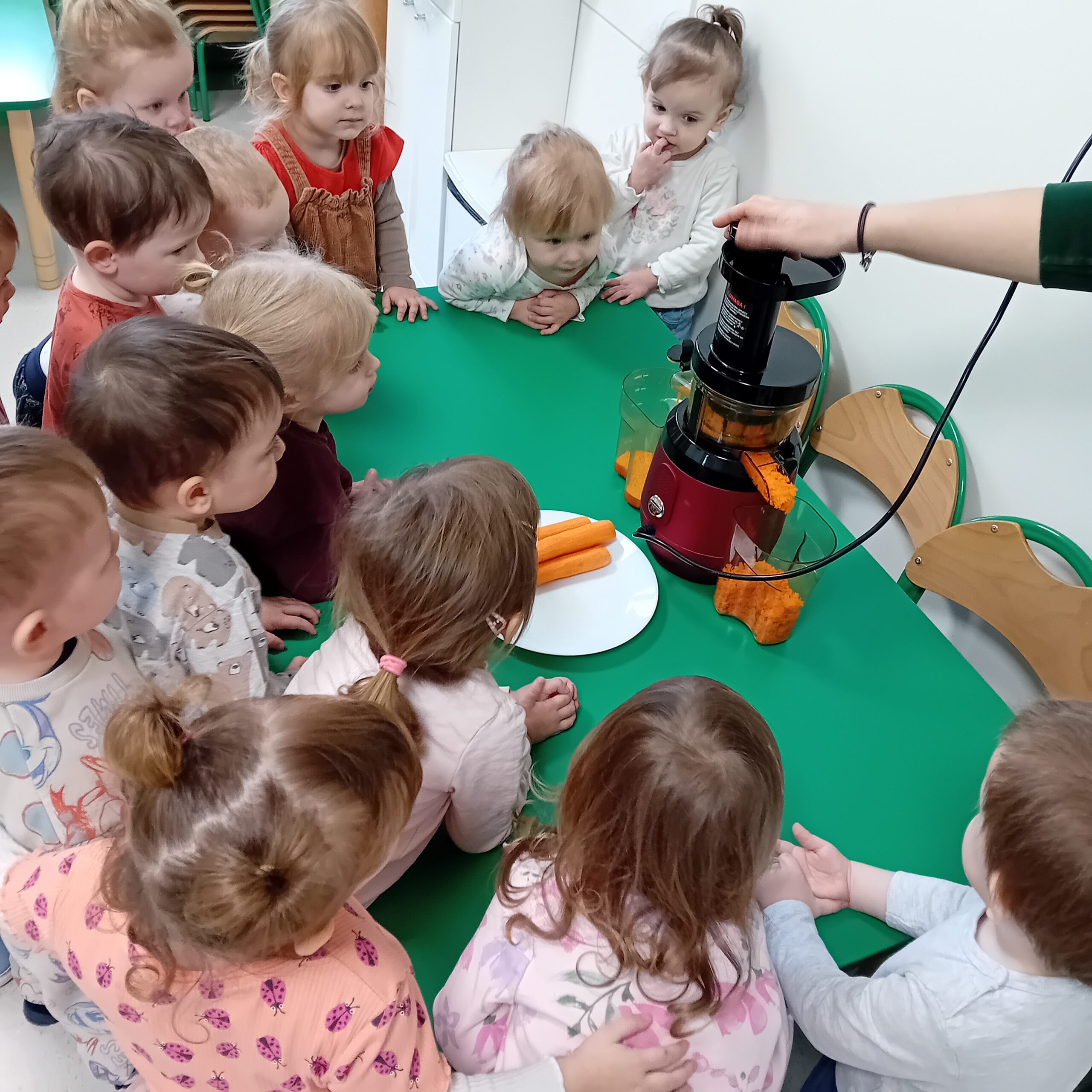 Przepyszny soczek dzisiaj zrobimy! Jabłko, marchewkę razem złączymy. Pomoże nam w tym sokowirówka, by wycisnąć soczek dla naszego zdrówka.