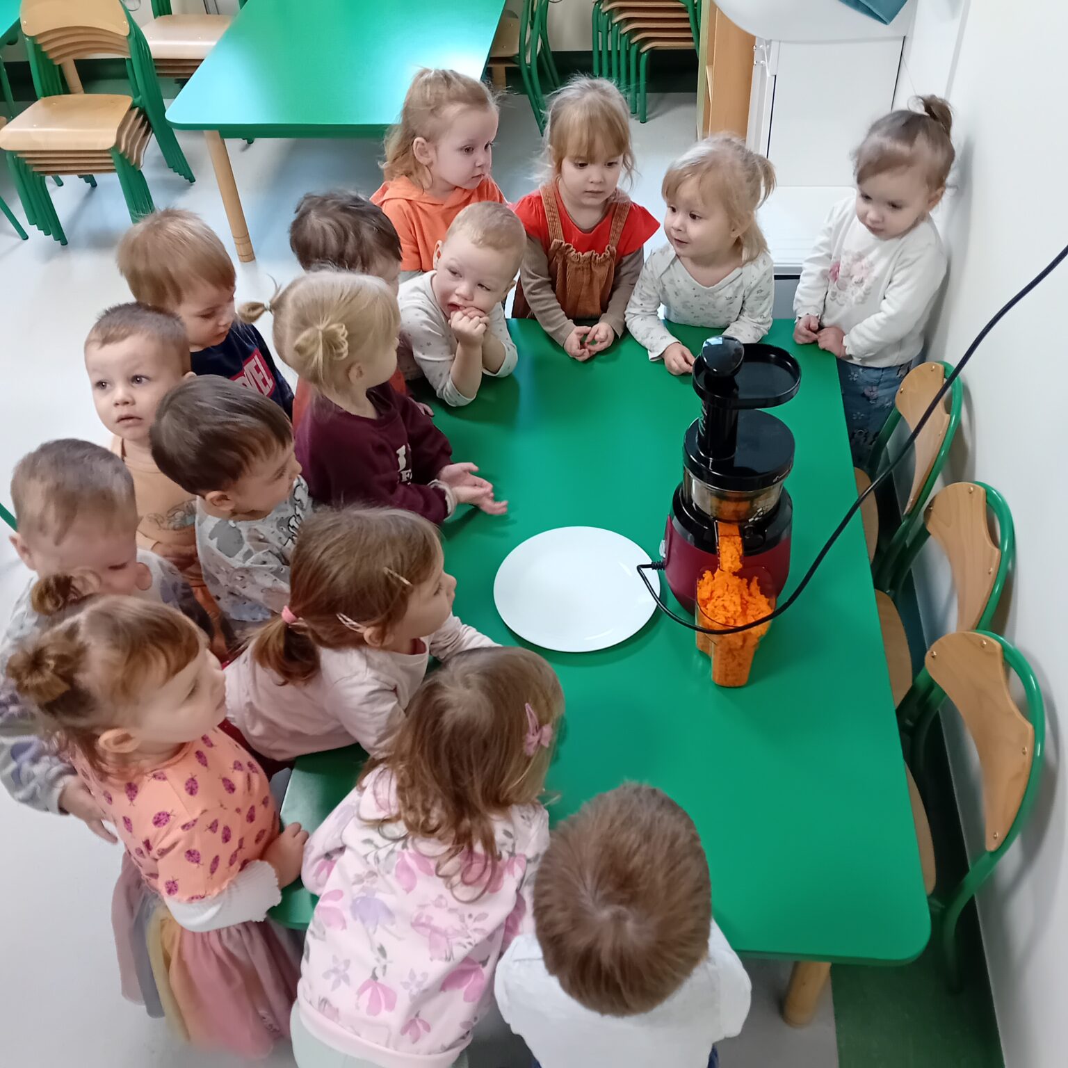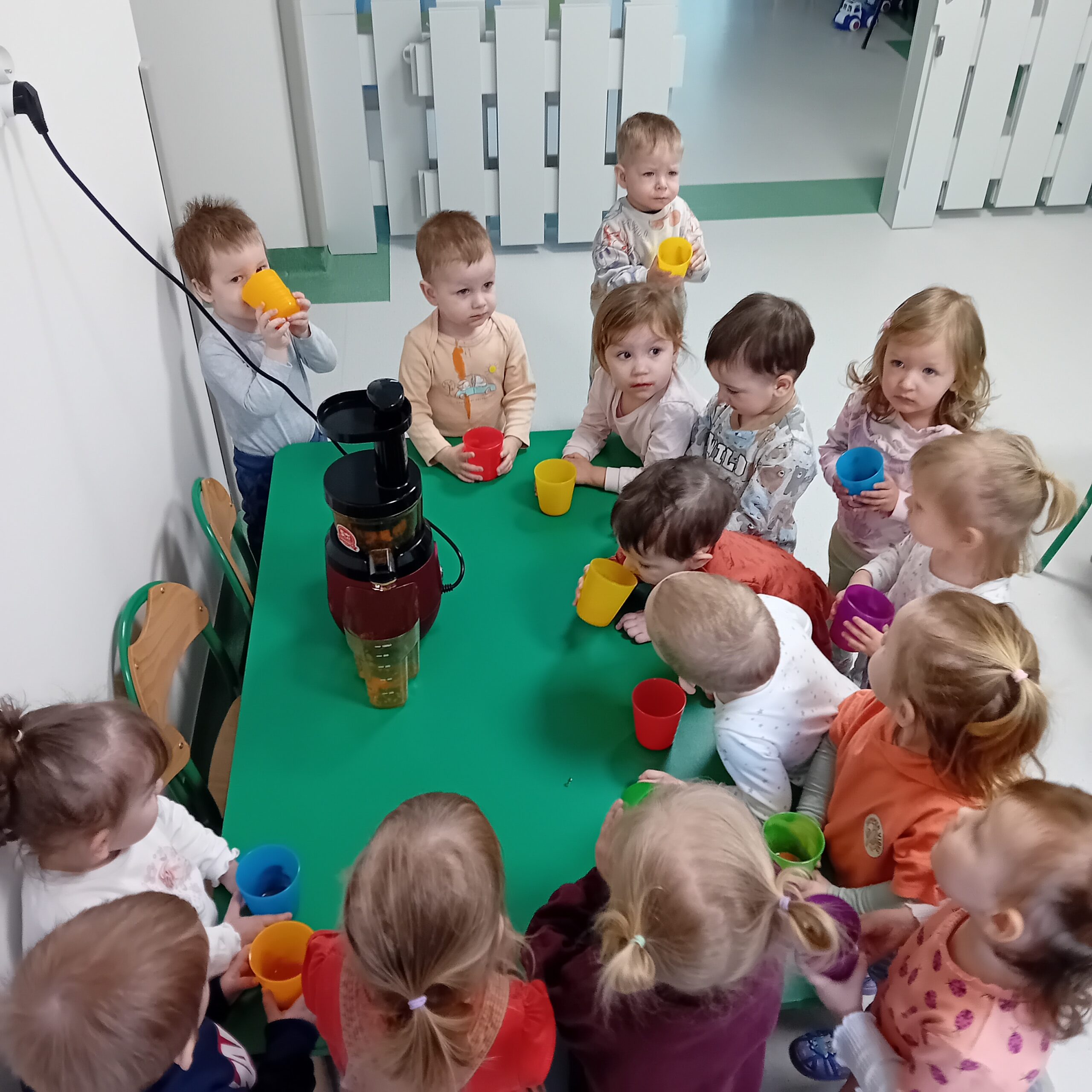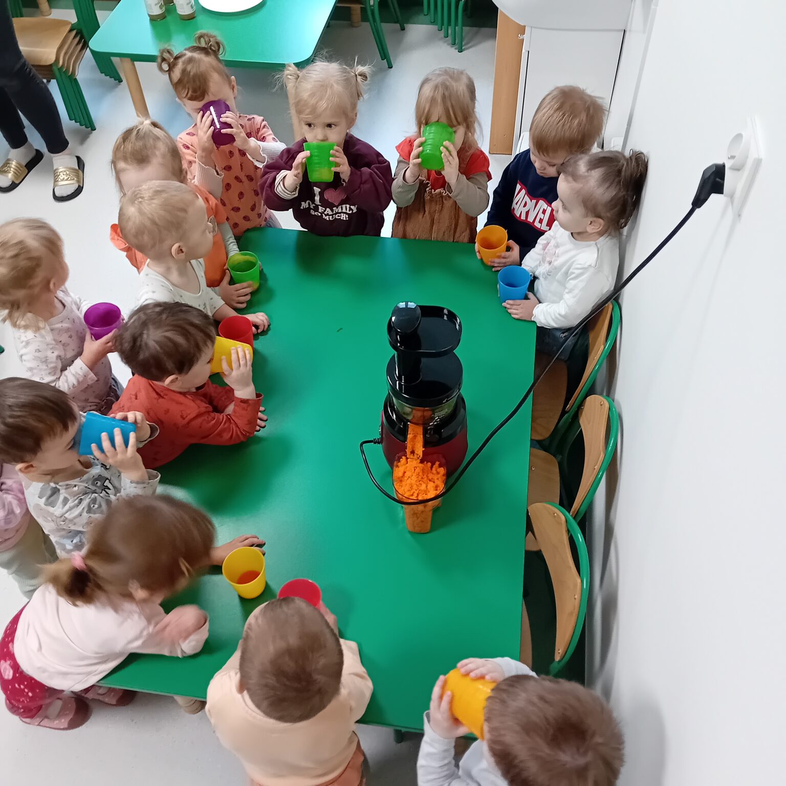 Przepyszny soczek dzisiaj zrobimy! Jabłko, marchewkę razem złączymy. Pomoże nam w tym sokowirówka, by wycisnąć soczek dla naszego zdrówka.